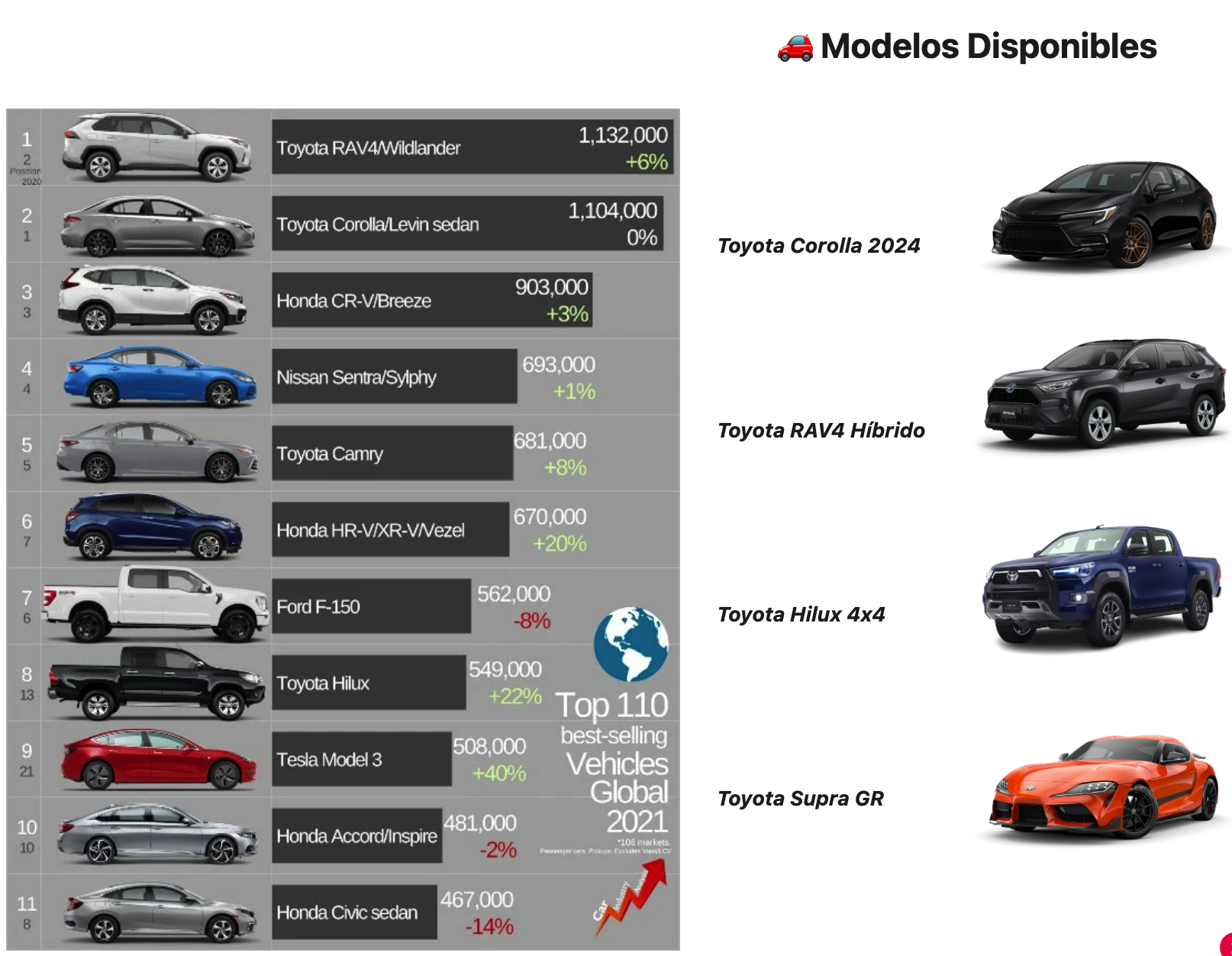Toyota es una de las marcas líderes a nivel mundial en el sector automotriz. En AutosXtrem te presentamos sus modelos más destacados, ideales tanto para ciudad como para carretera.